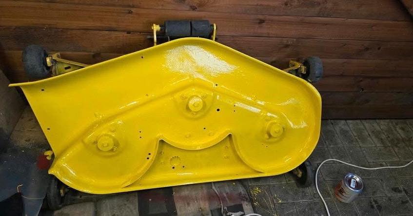 The mower has been repainted from the bottom up, and the blades have been sharpened. The mower is in good condition.
