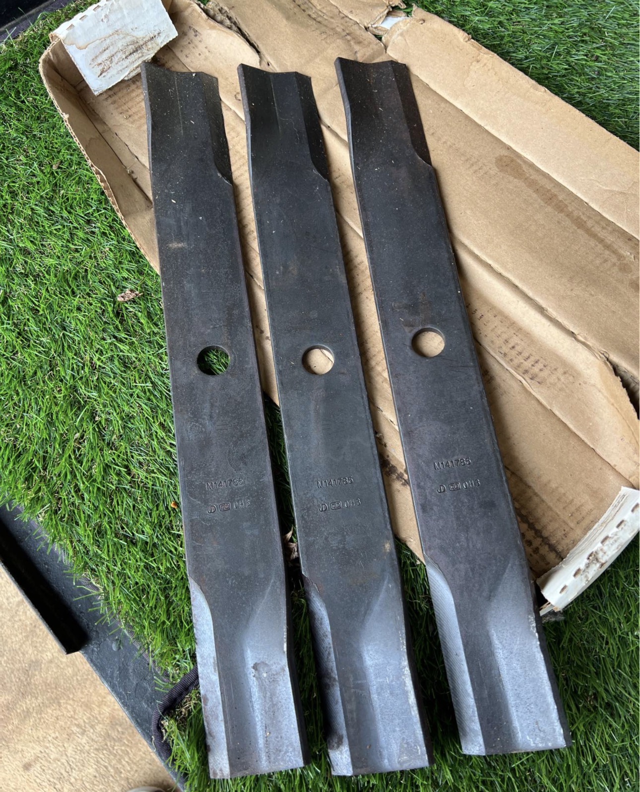 new set of 3 John Deere mower blades (Part number M141785) available. They’re still in the box and never been installed.
